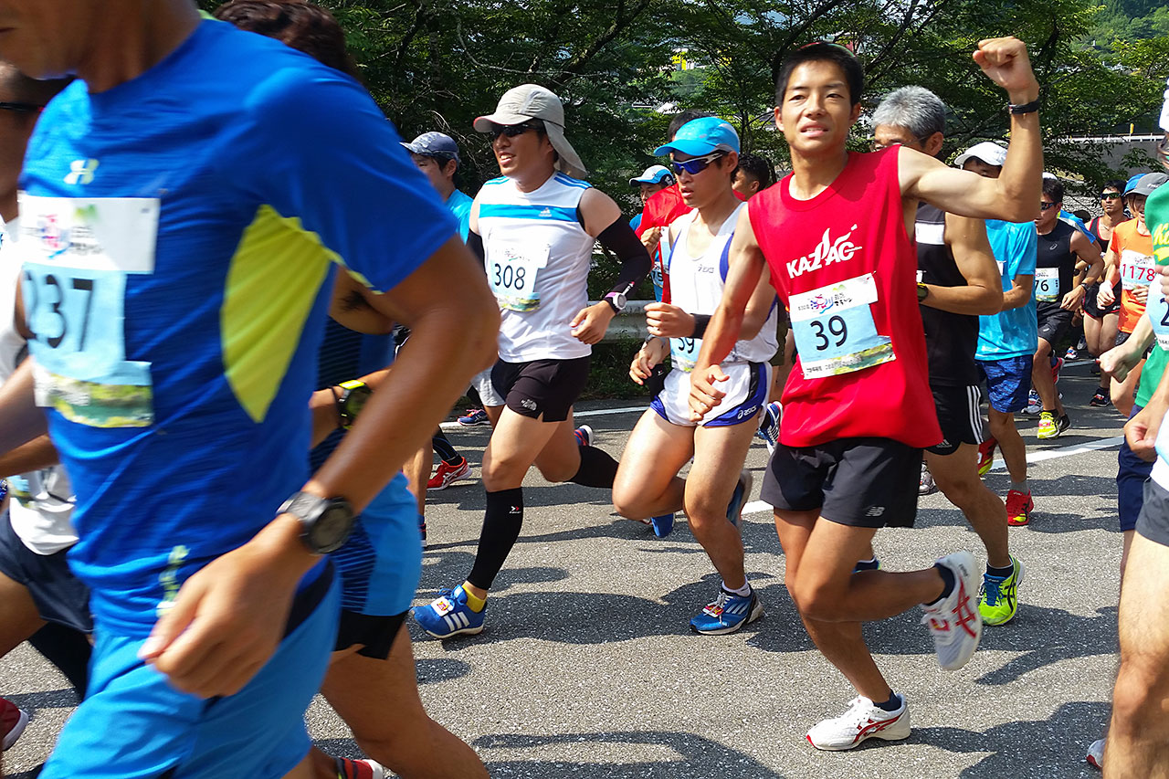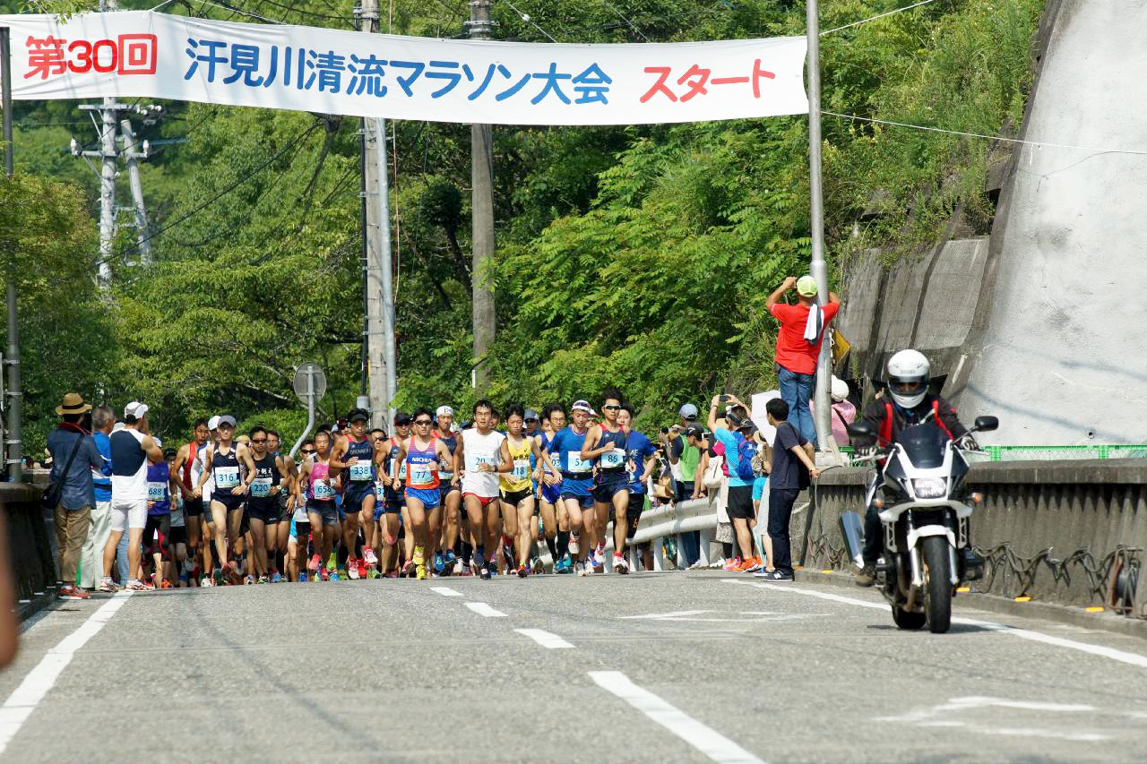真夏に涼しげな清流や山の緑を眺めながら、汗見川沿いを走るマラソン大会です。